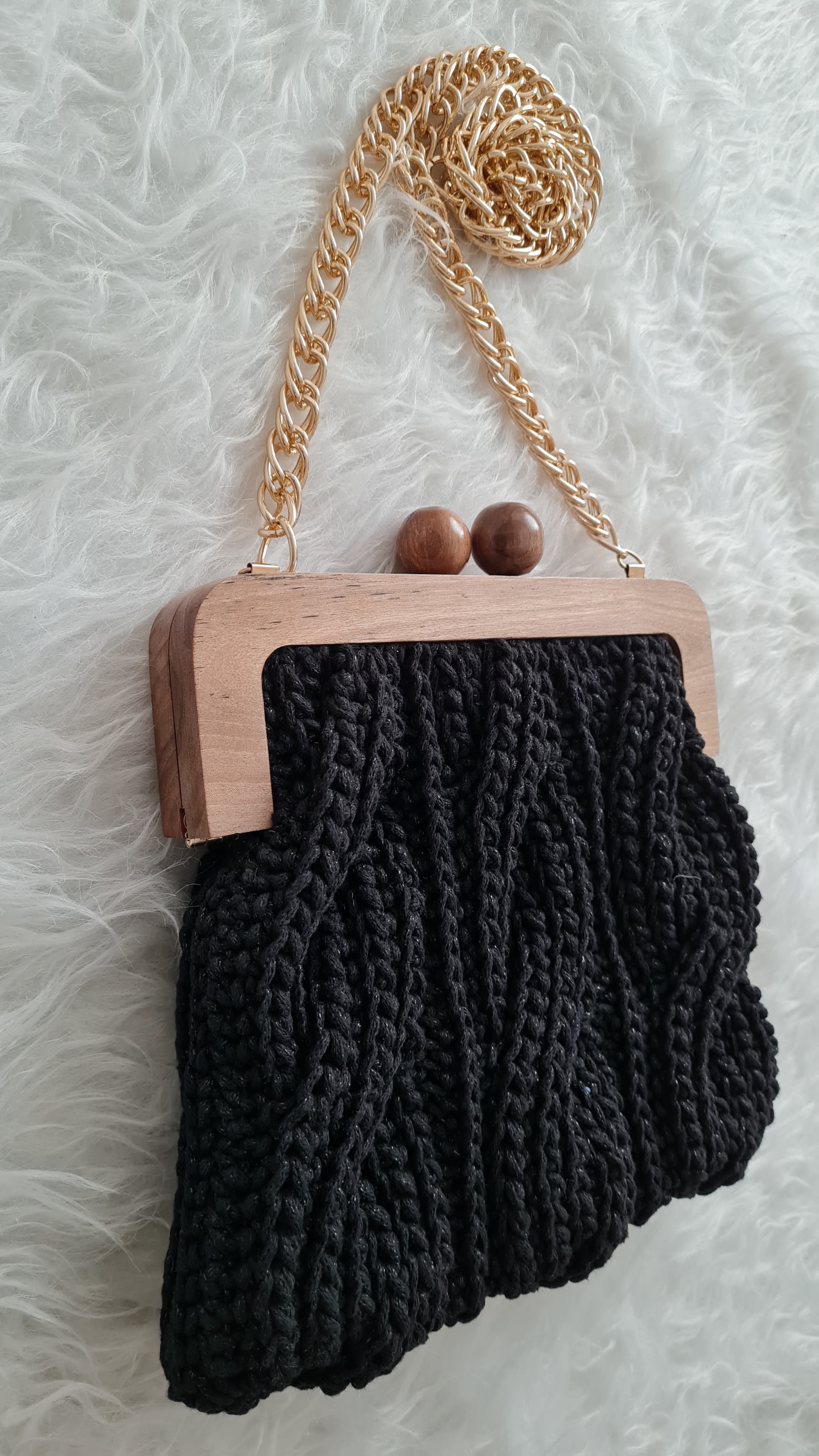 جنس مکرومه کتان لمه دار، داخل استرکشی شده، دارای جیب کوچک داخلی، دهانه ی چوبی، بند فلزی باکیفیت